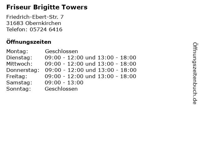| Öffnungszeiten Friseur Brigitte Towers in Obernkirchen anzeigen | |