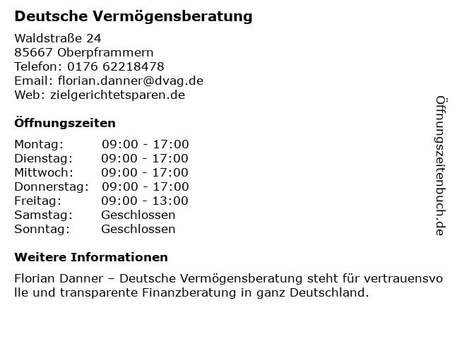 1 Deutsche Vermögensberatung (Dvag), Rudolf Kerschl (Entfernung: 0,69 km) Raiffeisenstr. 12, 85667 Oberpframmern 2 Deutsche Vermögensberatung- Uschi Kerschl (Entfernung: 1,10 km) St.-Andreas-Weg 11c, 85667 Oberpframmern 6 Manfred Strasser Versicherungen u. Vermögensberatung (Entfernung: 13,33 km) Feldkirchener Str. 51 B, 85540 Haar |