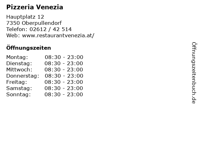 | Öffnungszeiten Pizzeria Venezia in Oberpullendorf anzeigen | |