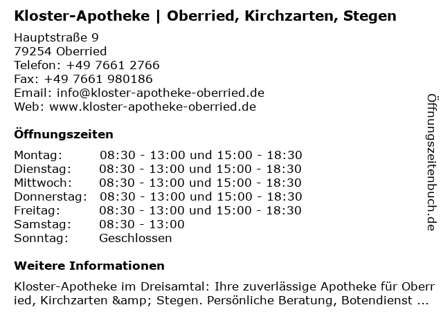 Branchen & Suchbegriffe zu Kloster-Apotheke | Oberried, Kirchzarten, Stegen:apotheke, diabetes beratung, gesundheitsprodukte, homöopathie, impftermine, inkontinenzversorgung, kirchzarten, kloster, kräutermedizin, mutter-kind apotheke, oberried, pflegehilfsmittel, schönheitsprodukte, stegen, tiermedizin |