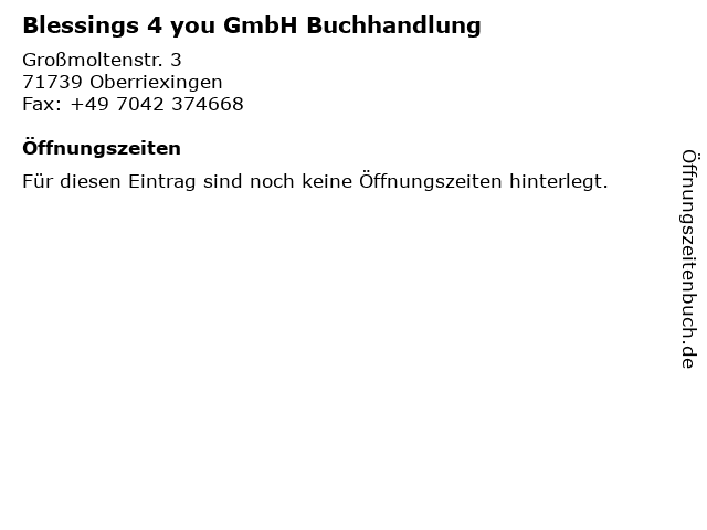 | Öffnungszeiten Blessings 4 you GmbH Buchhandlung in Oberriexingen anzeigen | |
