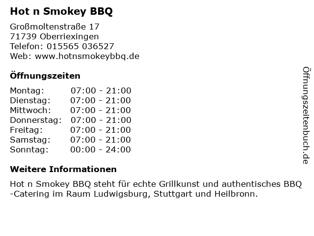 | Öffnungszeiten Hot n Smokey BBQ in Oberriexingen anzeigen | |