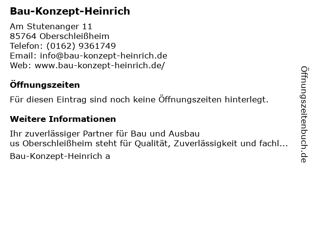 | Öffnungszeiten Bau-Konzept-Heinrich in Oberschleißheim anzeigen | |