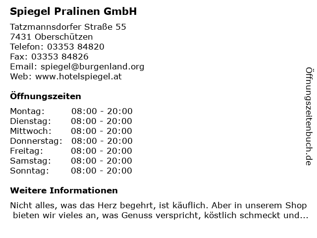 | Öffnungszeiten Spiegel Pralinen GmbH in Oberschützen anzeigen | |