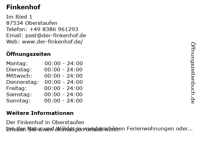 | Öffnungszeiten Finkenhof in Oberstaufen anzeigen | |