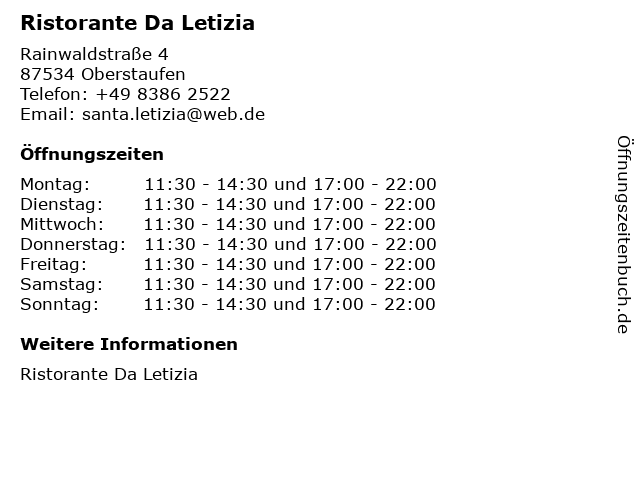 | Öffnungszeiten Ristorante Da Letizia in Oberstaufen anzeigen | |