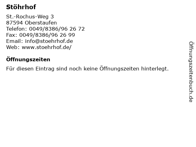 | Öffnungszeiten Stöhrhof in Oberstaufen anzeigen | |