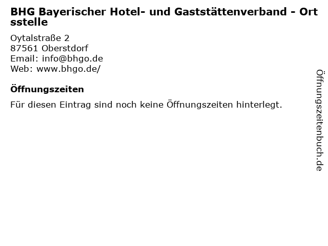 | Öffnungszeiten BHG Bayerischer Hotel- und Gaststättenverband - Ortsstelle in Oberstdorf anzeigen | |