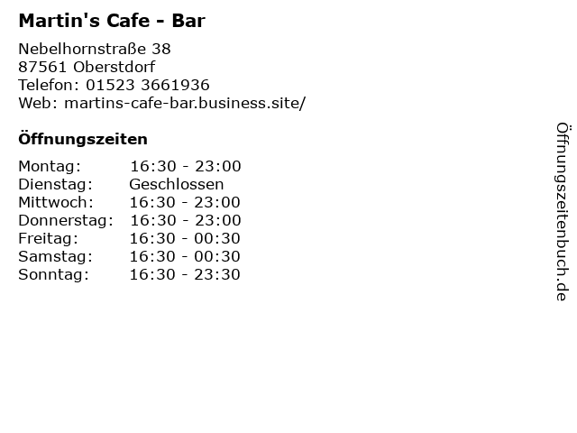 | Öffnungszeiten Martin's Cafe - Bar in Oberstdorf anzeigen | |