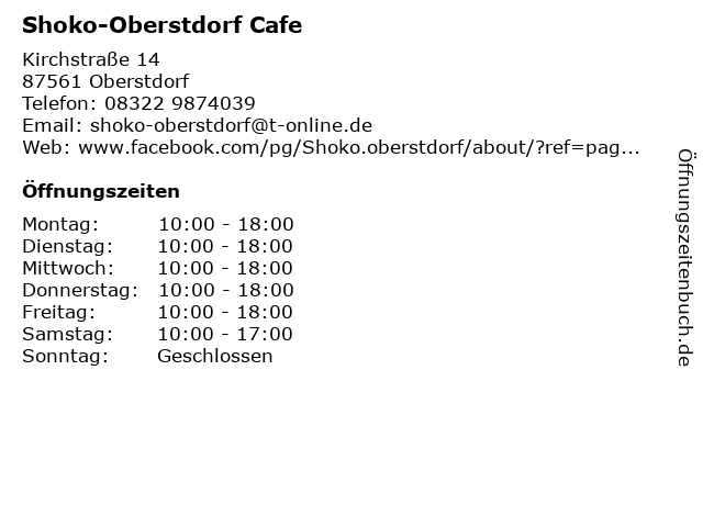| Öffnungszeiten Shoko-Oberstdorf Cafe in Oberstdorf anzeigen | |