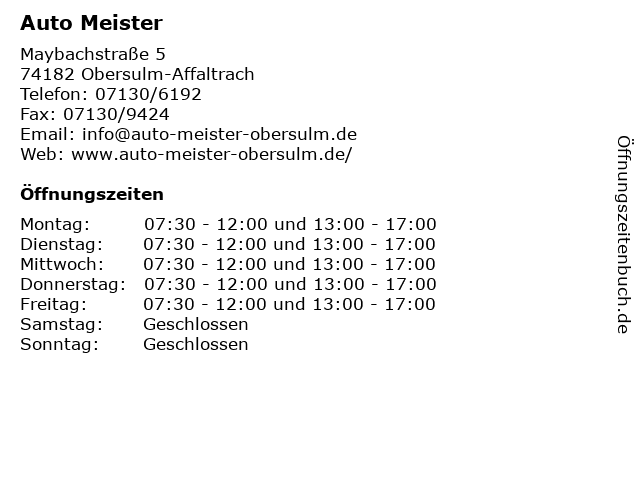 | Öffnungszeiten Auto Meister in Obersulm-Affaltrach anzeigen | |