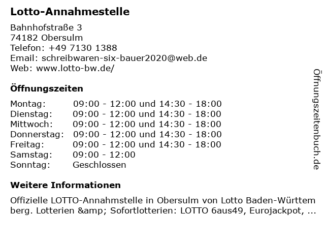 | Öffnungszeiten Lotto-Annahmestelle in Obersulm anzeigen | |