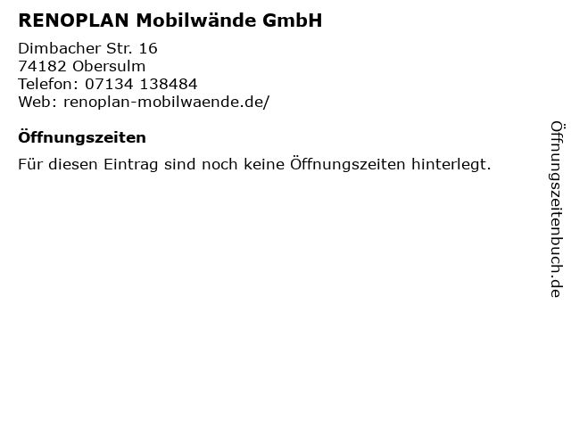 | Öffnungszeiten RENOPLAN Mobilwände GmbH in Obersulm anzeigen | |