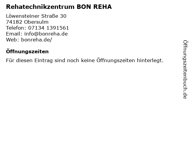 | Öffnungszeiten Rehatechnikzentrum BON REHA in Obersulm anzeigen | |