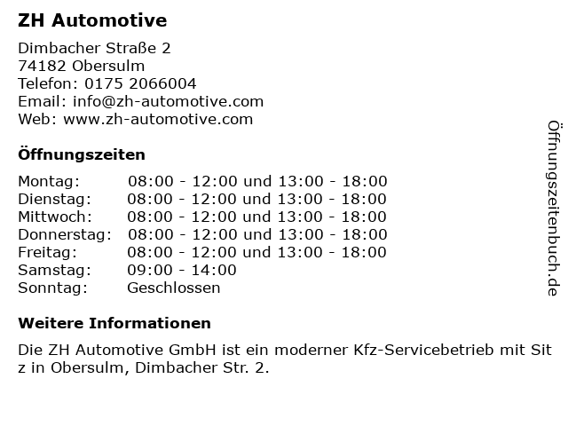 | Öffnungszeiten ZH Automotive in Obersulm anzeigen | |