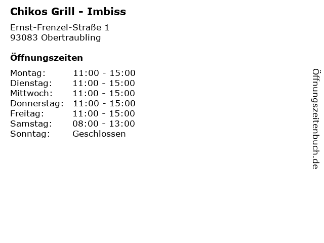 | Öffnungszeiten Chikos Grill - Imbiss in Obertraubling anzeigen | |