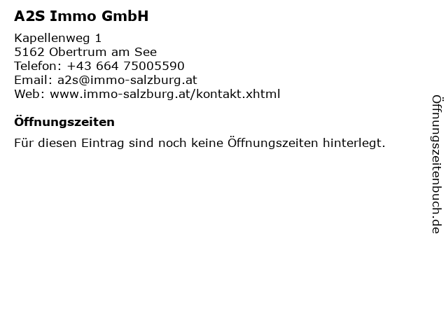 | Öffnungszeiten A2S Immo GmbH in Obertrum am See anzeigen | |