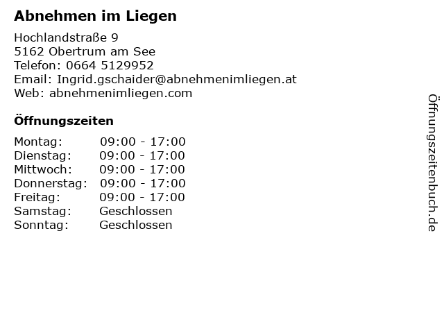 | Öffnungszeiten Abnehmen im Liegen in Obertrum am See anzeigen | |