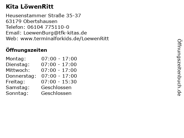 | Öffnungszeiten Kita LöwenRitt in Obertshausen anzeigen | |