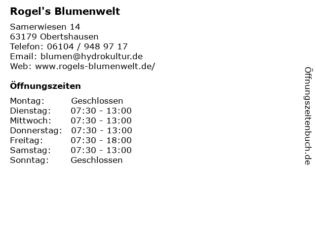 | Öffnungszeiten Rogel's Blumenwelt in Obertshausen anzeigen | |
