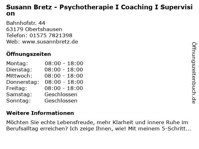 Branchen & Suchbegriffe zu Susann Bretz - Psychotherapie I Coaching I Supervision:bretz, coaching, psychologische beratung, psychotherapie, supervision, susann |