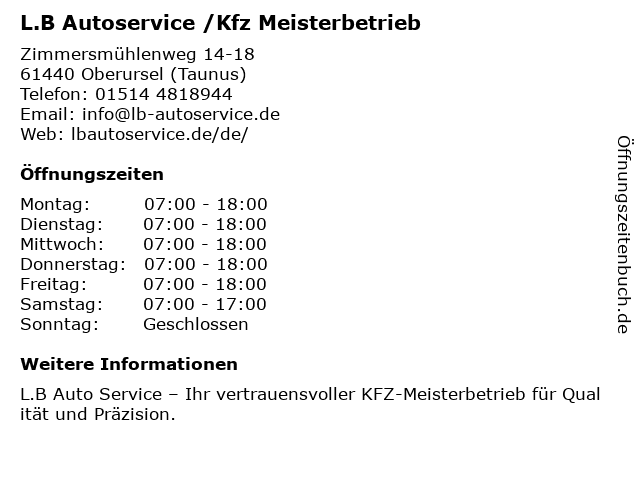 Branchen & Suchbegriffe zu L.B Autoservice /Kfz Meisterbetrieb:/kfz, abgasuntersuchung, autoservice, autowerkstatt, bremsendienste, fahrzeuginspektion, l.b, meisterbetrieb, motoreninstandsetzung |