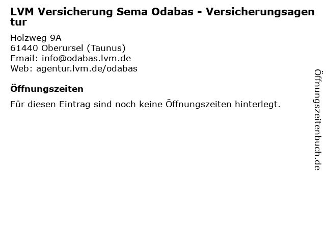 | Öffnungszeiten LVM Versicherung Sema Odabas - Versicherungsagentur in Oberursel (Taunus) anzeigen | |