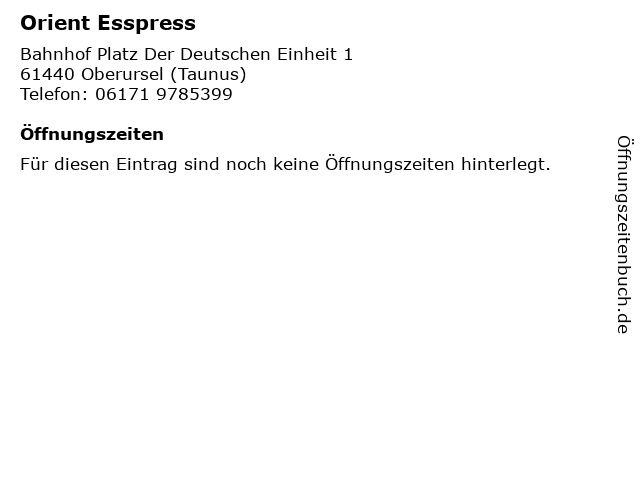 | Öffnungszeiten Orient Esspress in Oberursel (Taunus) anzeigen | |
