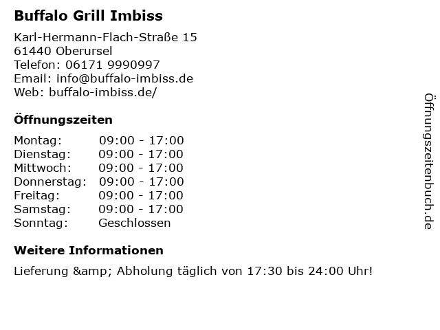 | Öffnungszeiten Buffalo Grill Imbiss in Oberursel anzeigen | |