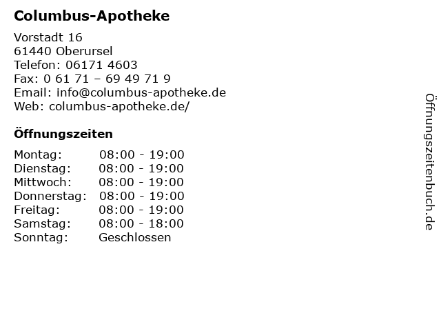 | Öffnungszeiten Columbus-Apotheke in Oberursel anzeigen | |