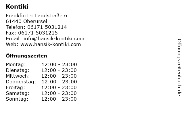 | Öffnungszeiten Kontiki in Oberursel anzeigen | |