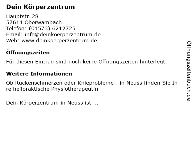 | Öffnungszeiten Dein Körperzentrum in Oberwambach anzeigen | |