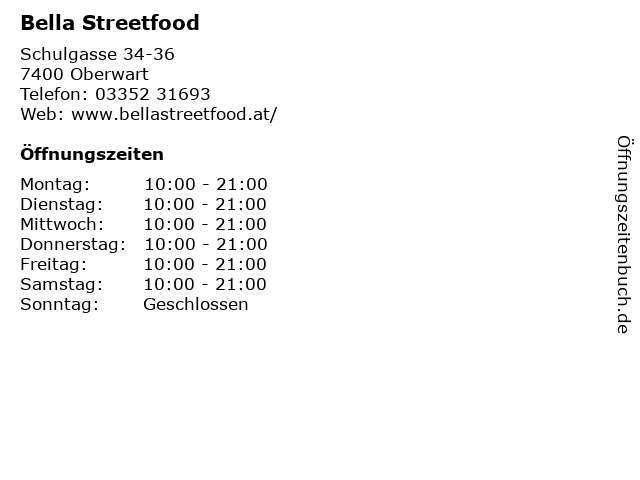 | Öffnungszeiten Bella Streetfood in Oberwart anzeigen | |