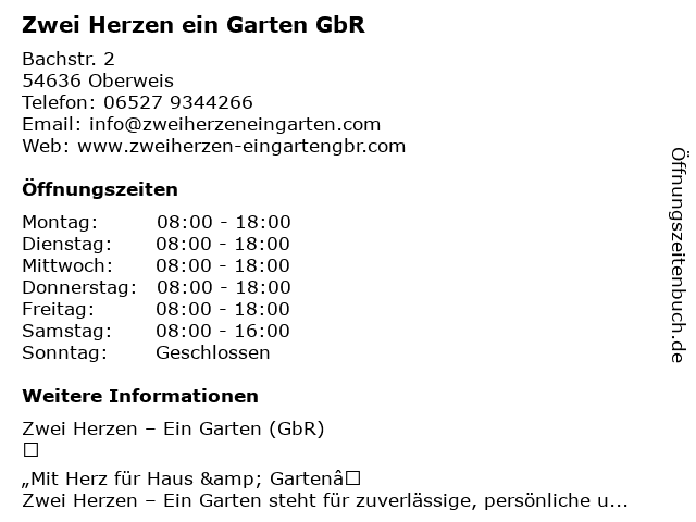 | Öffnungszeiten Zwei Herzen ein Garten GbR in Oberweis anzeigen | |