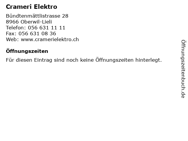 | Öffnungszeiten Crameri Elektro in Oberwil-Lieli anzeigen | |