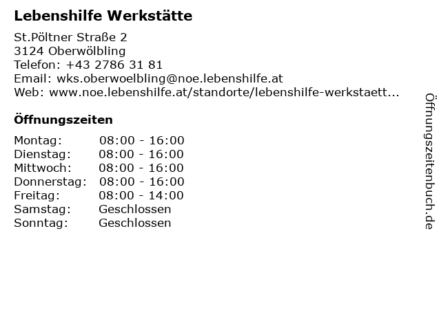 | Öffnungszeiten Lebenshilfe Werkstätte in Oberwölbling anzeigen | |