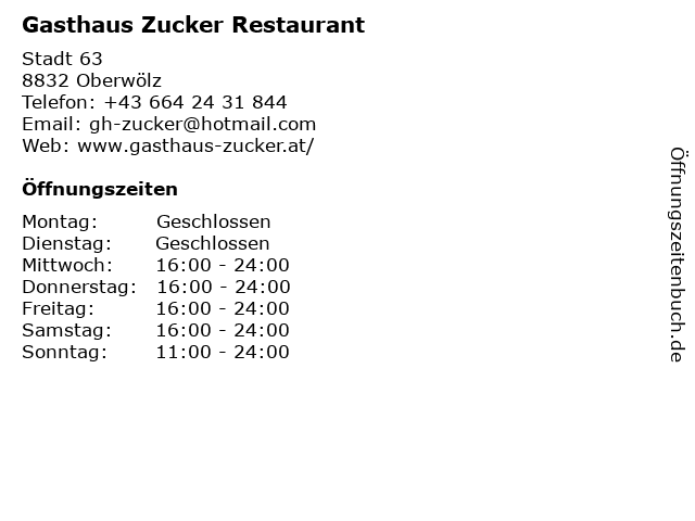 | Öffnungszeiten Gasthaus Zucker Restaurant in Oberwölz anzeigen | |