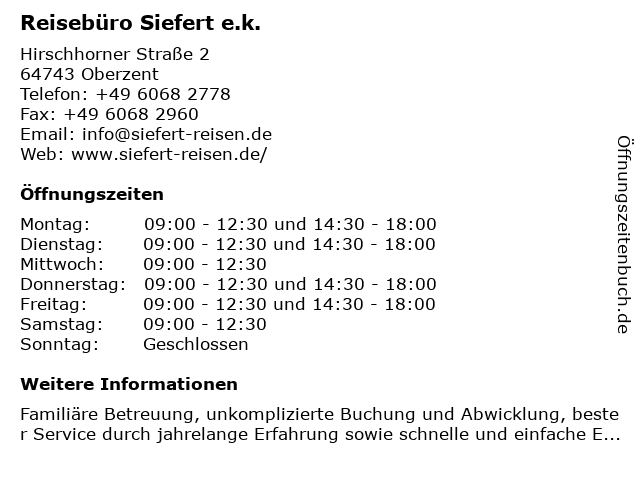 | Öffnungszeiten Reisebüro Siefert e.k. in Oberzent anzeigen | |