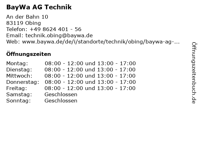 | Öffnungszeiten BayWa AG Technik in Obing anzeigen | |