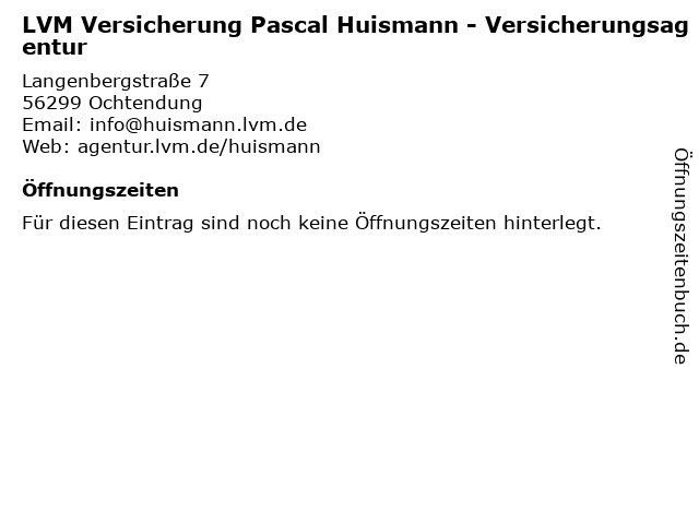| Öffnungszeiten LVM Versicherung Pascal Huismann - Versicherungsagentur in Ochtendung anzeigen | |