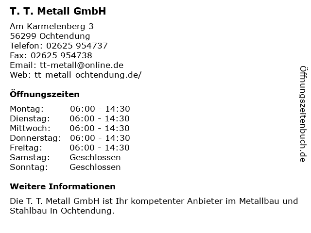 | Öffnungszeiten T. T. Metall GmbH in Ochtendung anzeigen | |