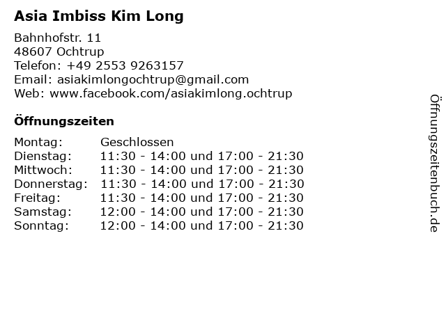 | Öffnungszeiten Asia Imbiss Kim Long in Ochtrup anzeigen | |