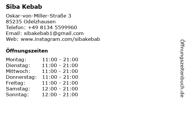 | Öffnungszeiten Siba Kebab in Odelzhausen anzeigen | |