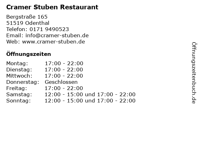 | Öffnungszeiten Cramer Stuben Restaurant in Odenthal anzeigen | |