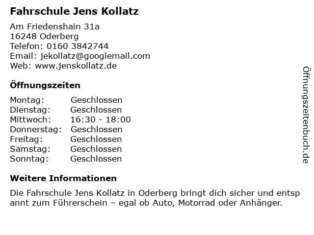 | Öffnungszeiten Fahrschule Jens Kollatz in Oderberg anzeigen | |