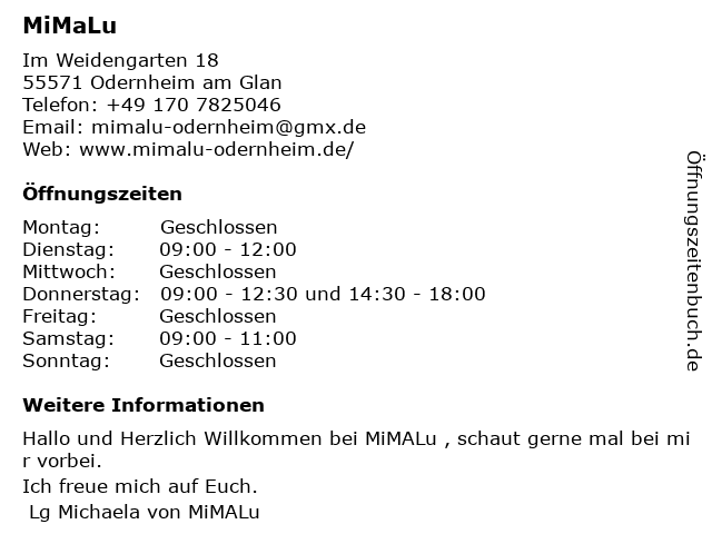 | Öffnungszeiten MiMaLu in Odernheim am Glan anzeigen | |