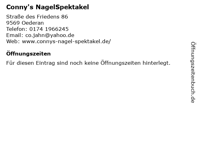 | Öffnungszeiten Conny's NagelSpektakel in Oederan anzeigen | |