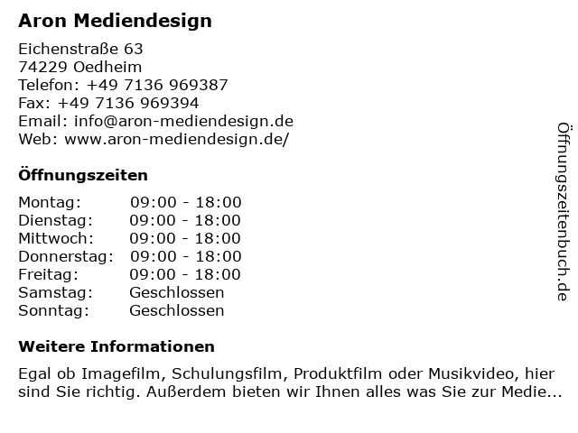 | Öffnungszeiten Aron Mediendesign in Oedheim anzeigen | |