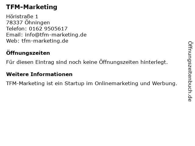 | Öffnungszeiten TFM-Marketing in Öhningen anzeigen | |