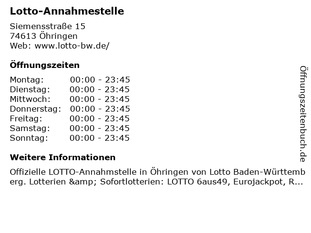 | Öffnungszeiten Lotto-Annahmestelle in Öhringen anzeigen | |